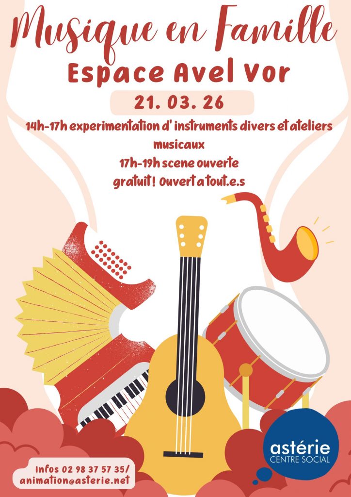 MUSIQUE EN FAMILLE 4 Mar 2026 | Actualités, Familles Venez expérimenter divers instruments de musique et jouer en famille ou seul·e·s de 14h à 17h à l’espace Avel Vor. Une scène ouverte sera à votre disposition de 17h à 19h. Gratuit . Ouvert à tous·tes.