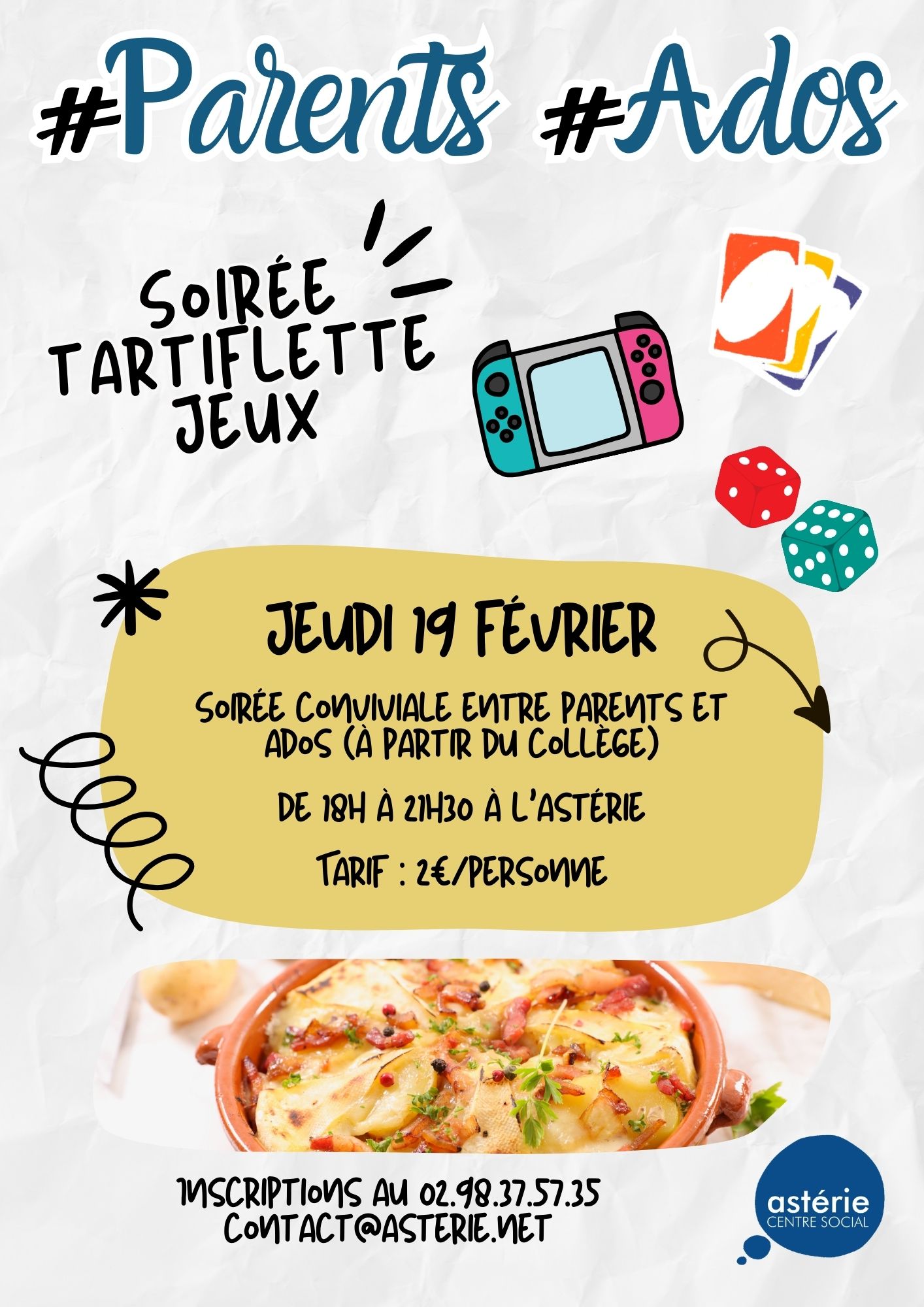 #PARENTS#ADOS 29 Jan 2026 | Actualités, Enfants, Ados, Familles Jeudi 19 février de 18h à 21h30 au centre social, soirée conviviale entre parents et ados (à partir du collège). On cuisine, on mange, on joue !! Sur inscription, 2€ / personne.